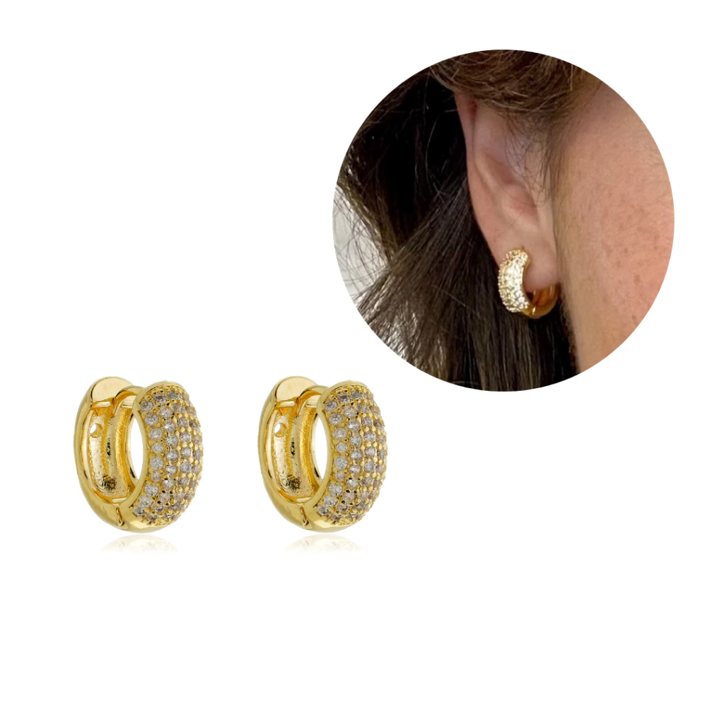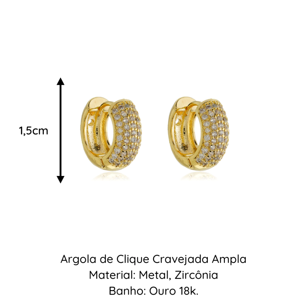Apresentando um brinco de argola de clique amplo e deslumbrante, este acessório é uma expressão de sofisticação e glamour. A argola de clique é generosa em tamanho, proporcionando um visual impactante e elegante. Seu design amplo e envolvente adiciona uma dose de ousadia ao seu estilo. Ao redor da superfície da argola, zircônias cravejadas adicionam um toque de brilho e luxo. As zircônias capturam a luz de maneira deslumbrante, criando um efeito cintilante que certamente atrairá olhares admiradores. Este brinco de argola é perfeito para quem busca uma peça de destaque e elegância para complementar seu visual. Use-o para elevar instantaneamente qualquer look, seja para uma ocasião especial ou para adicionar um toque de glamour ao dia a dia. Com seu design impressionante e detalhes brilhantes, este brinco certamente será uma adição deslumbrante à sua coleção de joias.