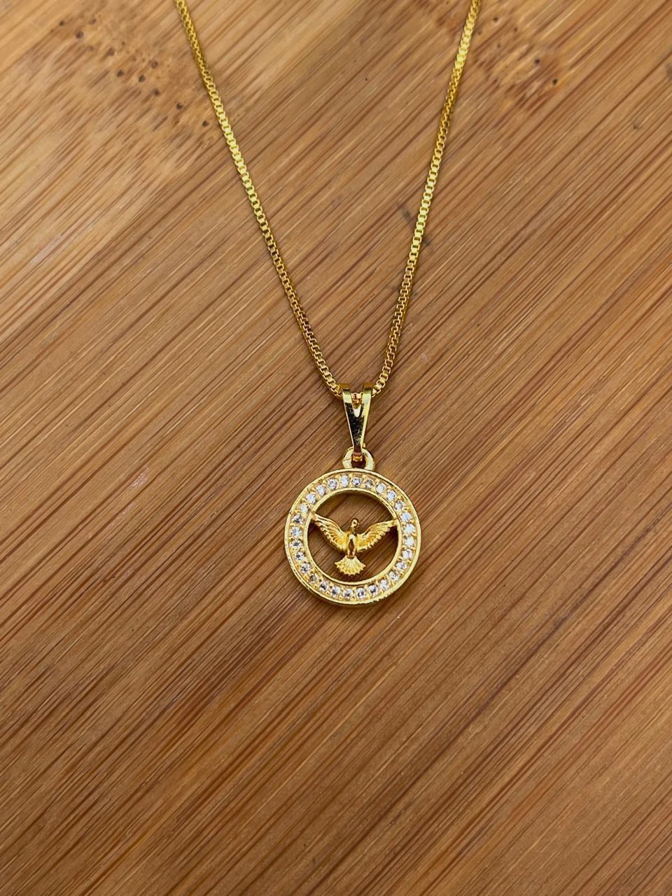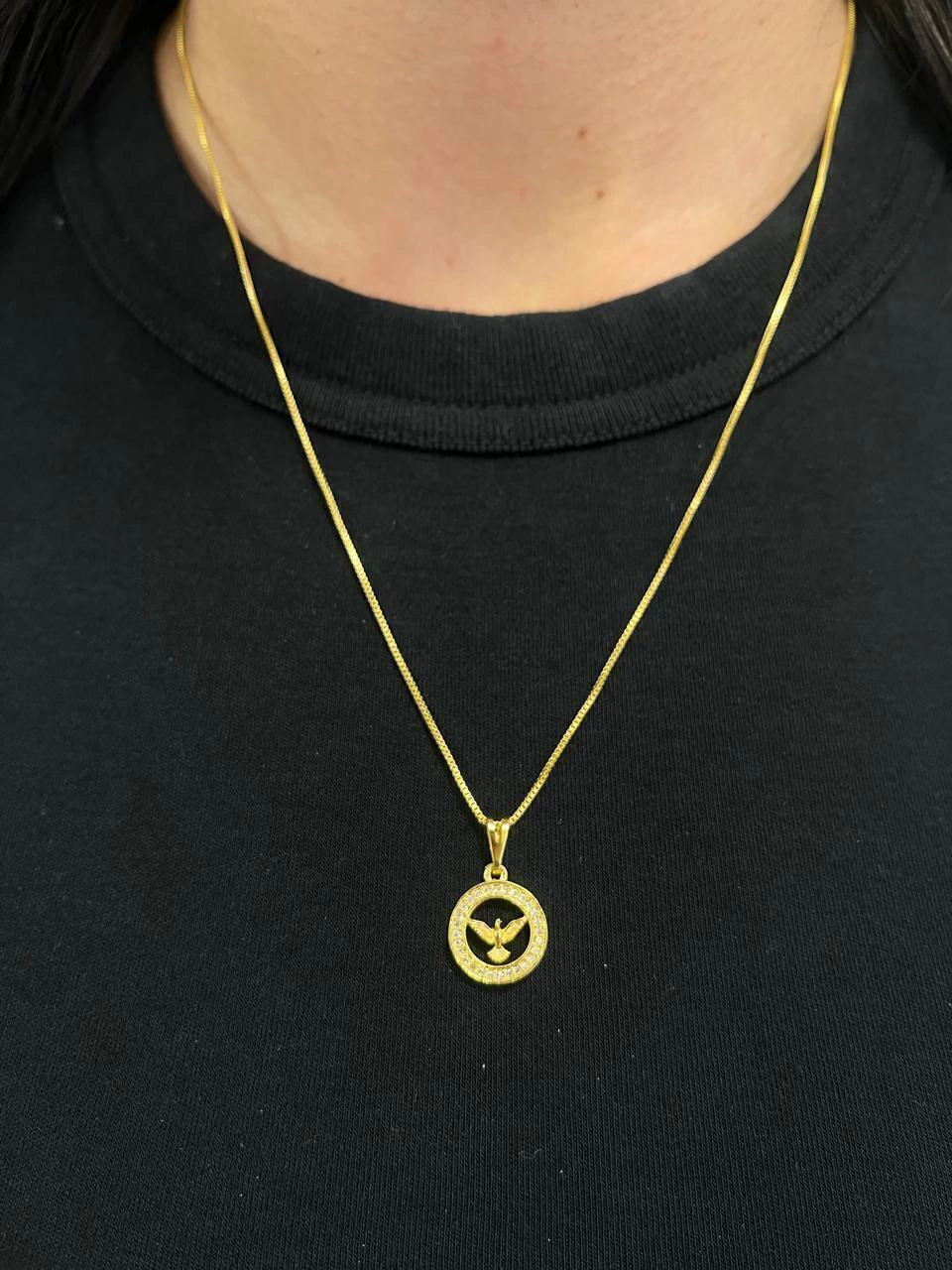 Colar com pingente redondo do Espírito Santo, símbolo de fé e proteção, com zircônias cravejadas que trazem brilho sutil e elegante. A corrente veneziana garante leveza, resistência e um caimento refinado. Uma joia com significado e sofisticação.