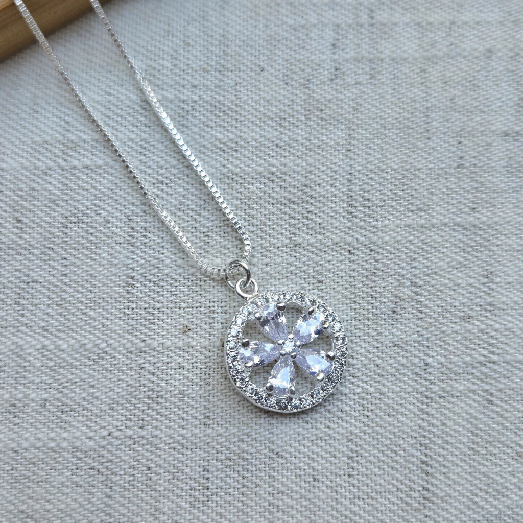 Este deslumbrante colar apresenta um pingente redondo totalmente cravejado em zircônias brilhantes, criando um efeito luminoso e sofisticado. Ao centro do pingente, uma delicada flor, também cravejada com zircônias, se destaca com seu design elegante e refinado. A combinação de formas e brilho confere à peça um toque de modernidade e delicadeza, perfeita para quem aprecia detalhes que fazem a diferença.